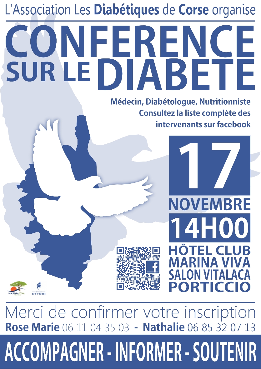 Nous organisons le 17 novembre 2012 une conférence sur le Diabète, qui aura lieu à l’Hotel Club « Marina Viva » Salon Vitalaca à Porticcio à partir de 14h00, dans le cadre de la « Journée Mondiale du diabète » du 14 novembre 2012 et pour le lancement officiel de l’Association Les Diabétique de Corse | ADC.